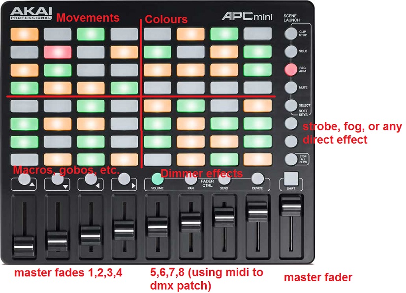 I am curious if there are any other lessoned learned on the APC Mini to get maximum use and versatility out of it. I have a couple moving heads and a full set of LED's. Just got the MINI and trying to think through what would be the best way, for example, having a button for each color and not programing colors into the scenes for the heads, maybe movements only, that would tie up a lot of my buttons however ( I could use a couple scenes and program the colors as steps, and use the steps slider not the scene, but would then have to manually adjust that slider on the computer). Maybe using one slider to control universal speed of the movements? (My fixtures have a channel for that).
